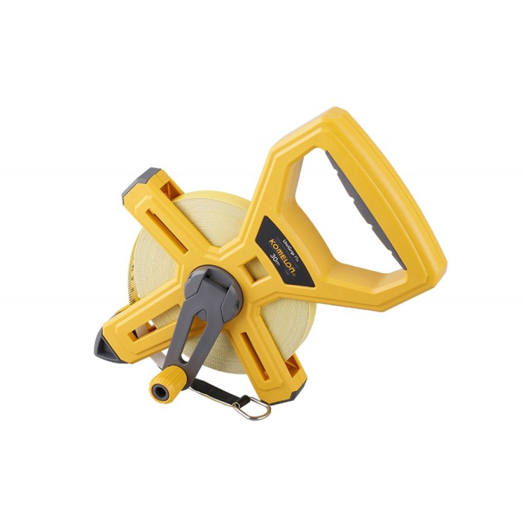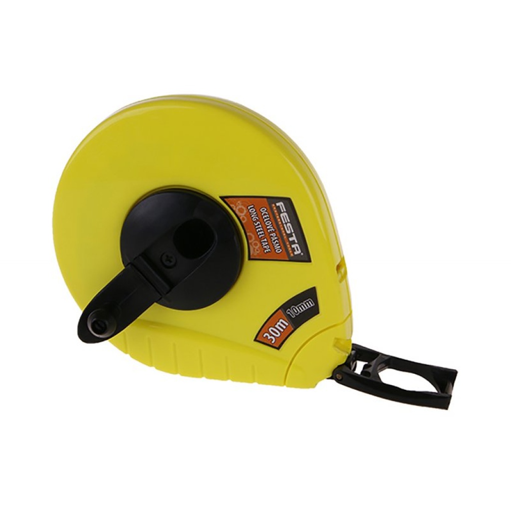 Kvalitetsstålbånd, hærdet bånd med øje og vippekrog – lettere måling, EØF-certifikat – egnet til kalibrering, sammenklappeligt viklehåndtag med sikkerhedslås, ABS-plast – mere slagfast, plastbælteclips, pakket på blister.