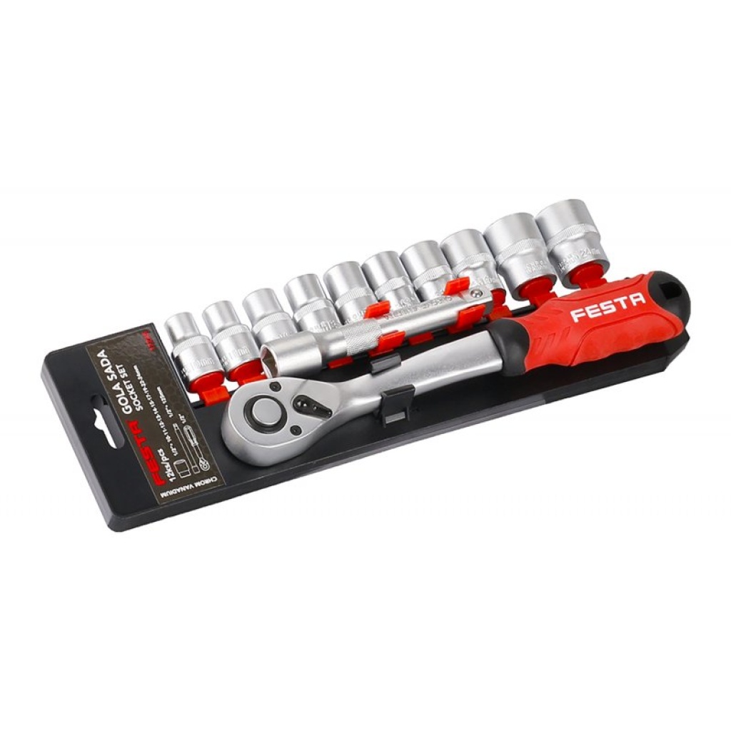 12 stk. topnøglesæt med skralde 1/2 i en gennemsigtig holder. Alle dele er fremstillet af krom-vanadium-stål af høj kvalitet, skralderne har en fin opdeling af 72 tænder med et vippehåndtag og en udløserknap, skraldekroppen er fremstillet af CrV-stål, tandmekanismen er fremstillet af S2-stål. Ergonomisk formet håndtag med ufarligt gummi. 10 års garanti. Til brug i industri og service.