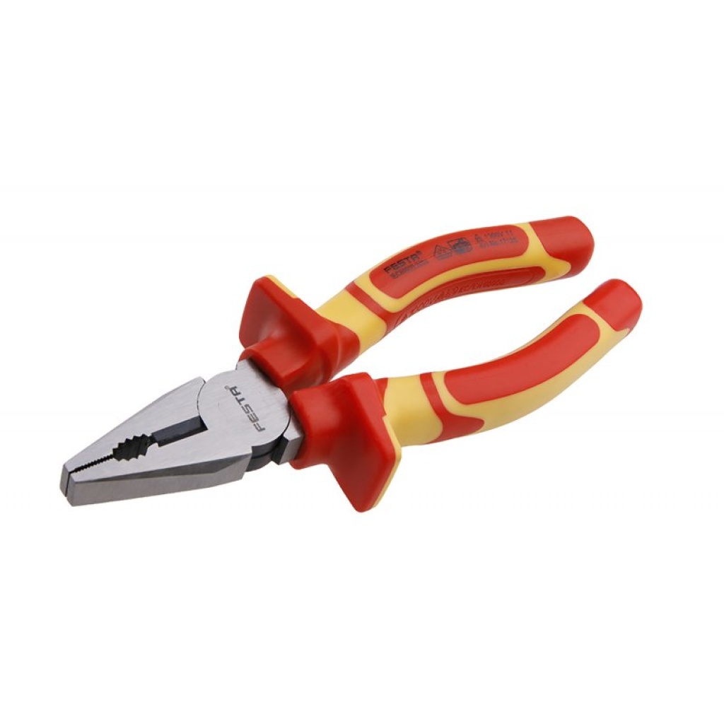 VDE kombinationstang 160 mm FESTA er elektrisk certificeret VDE 1000 V, IEC / EN 60900-2004, kombinationen af polypropylen og gummi på ergonomisk formede hænder garanterer fremragende skridsikre egenskaber og god modstandsdygtighed over for smøremidler og kemikalier. Gribekæber af særligt slidstærkt, højtydende krom-vanadium-stål. Vægt 0,283 kg.
