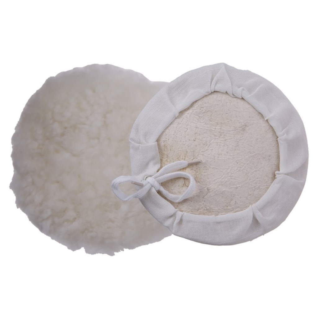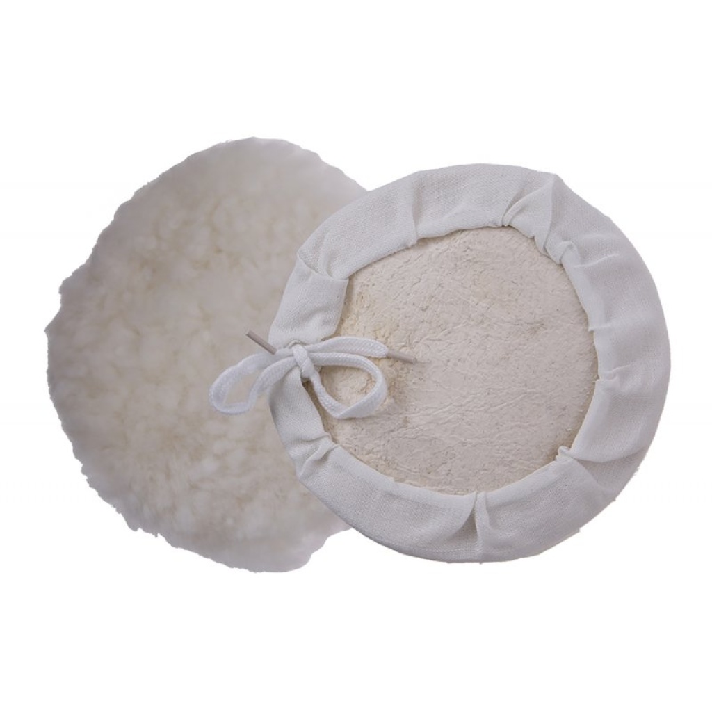 Flap-poleringsskive med krave – diameter 150 mm, materiale: 40% fåreuld / 60% syntetisk fiber, snorbinding, til polering af overflader for at opnå en høj glans.