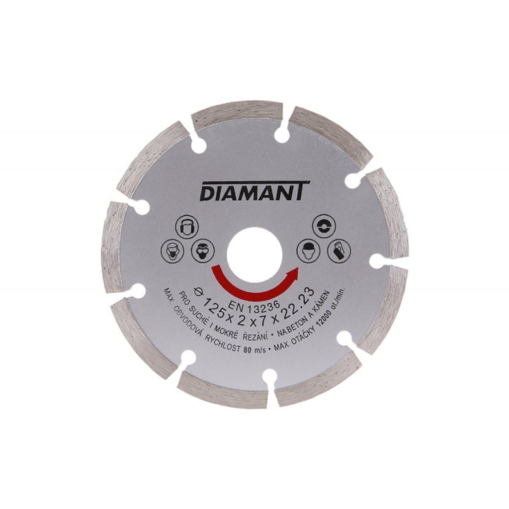 DIAMOND diamantklinge, design: SEGMENT, kvalitetsmaterialer og forarbejdning – højstyrkefastgørelse af diamantsegmenter til klingeskiven, højt indhold af diamantstøv i segmenterne, anvendelse: til tørskæring af beton, mursten, murværk, sten, …, emballage: blister med eurohul, inkl. reduktionsring fra 22,2 til 20 mm, mål: angivet i produktnavnet.