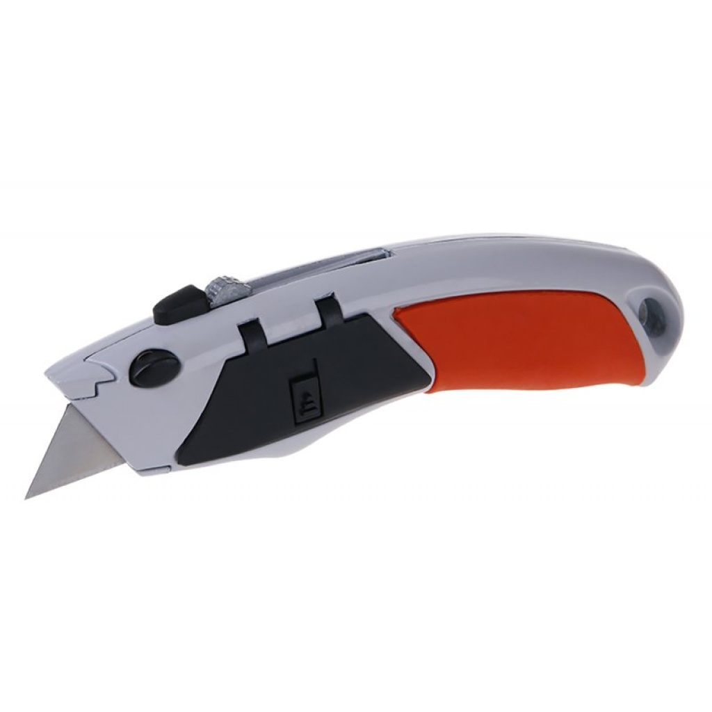 Metalkniv med udtrækkeligt trapezformet blad, bladet er monteret inde i knivkroppen på en glidende skyder, ergonomisk form, knap til nemt og hurtigt bladskift, magasin til reserveblade, automatisk bladskift (når magasinet er fuldt), 5 reserveblade.