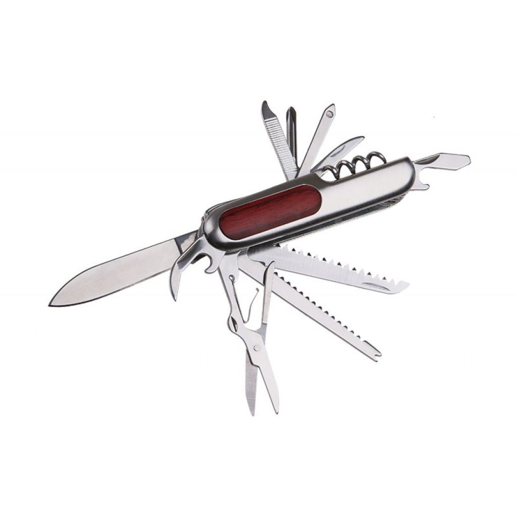 Lommekniv multifunktionel INOX. Længde på lukket kniv 95 mm. Multifunktionskniv i rustfrit stål med 11 forskellige dele til forskellige formål. Håndtag i kombination af metal og træ. Vægt 0,666 kg.