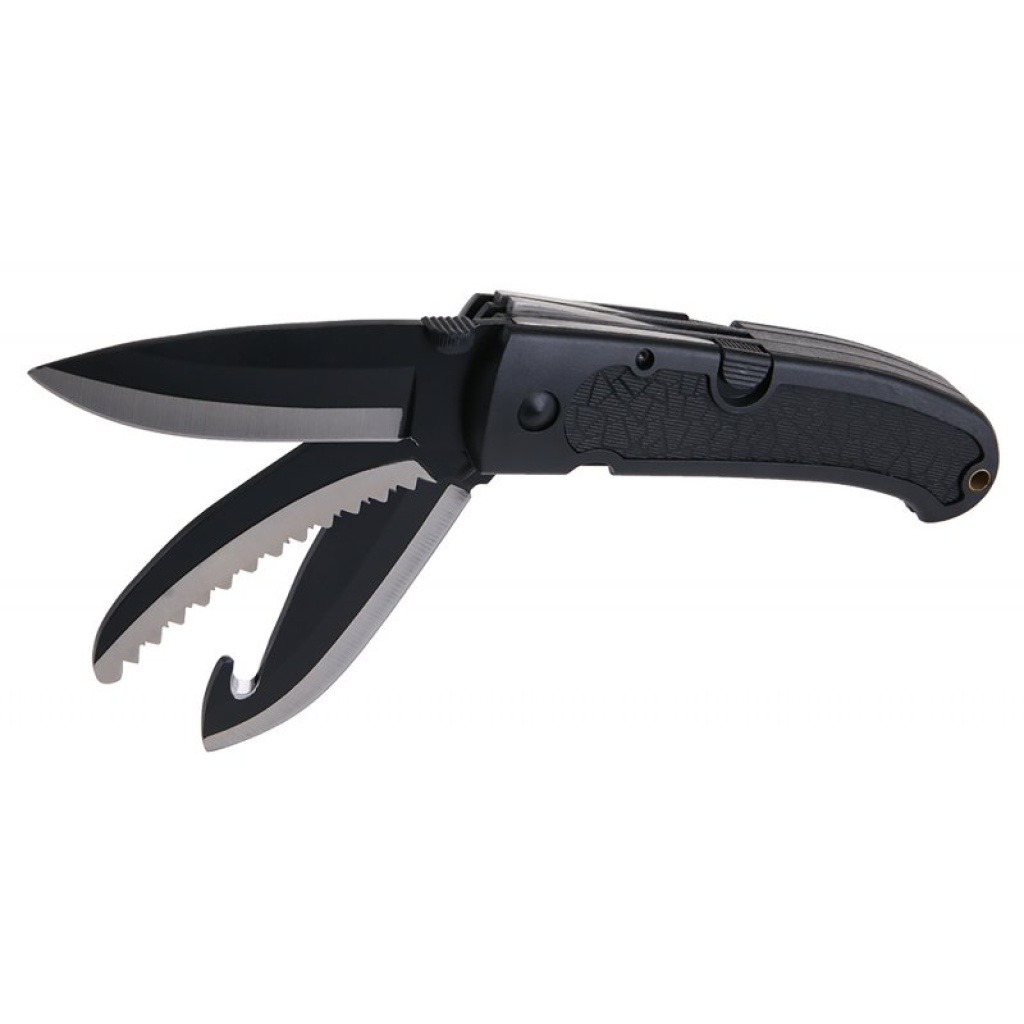 Lommekniv multifunktionel SHARK. Længden på den lukkede kniv er 130 mm. Multifunktionel kniv med 3 forskellige dele til forskellige formål. Håndtag i kombination af plast og gummi. Vægt 0,164 kg.