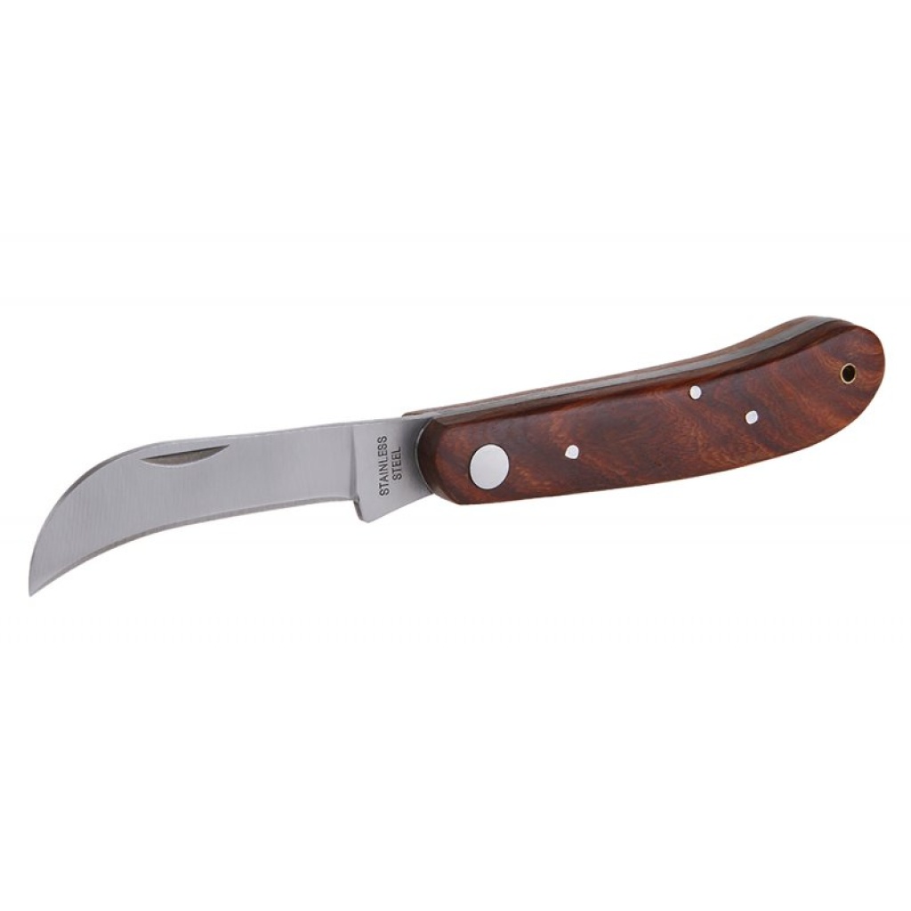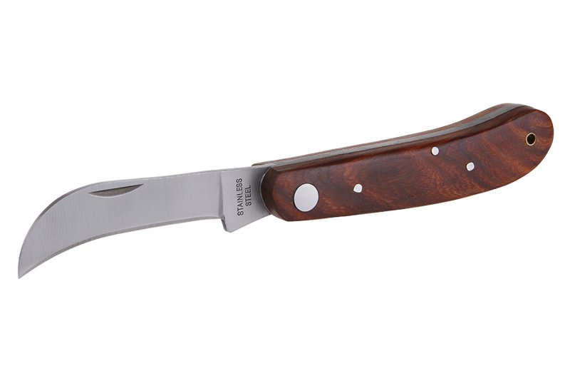 Podningskniv, stærkt blad af rustfrit stål, træhåndtag med kvalitetsnitter, til podning, skæring og behandling af træagtige planter og planter, bladlængde 105 mm, blister.