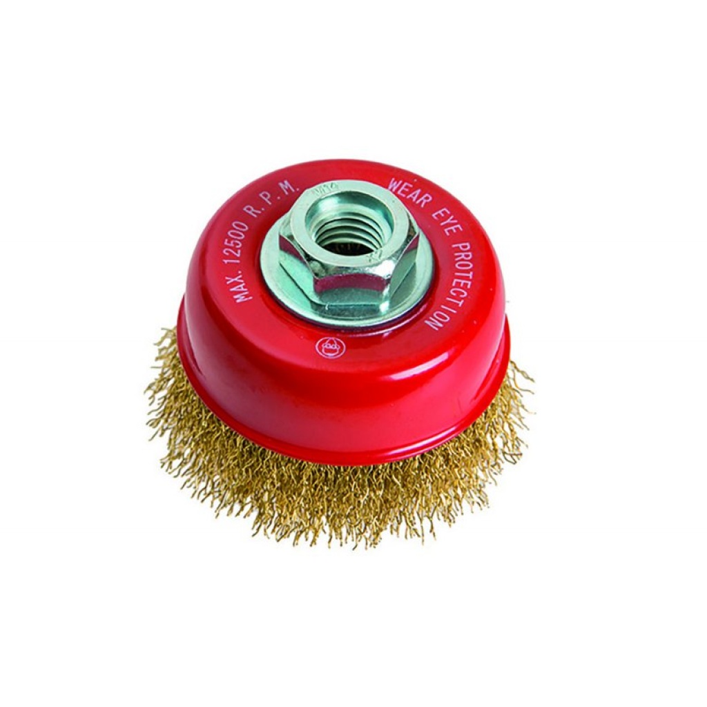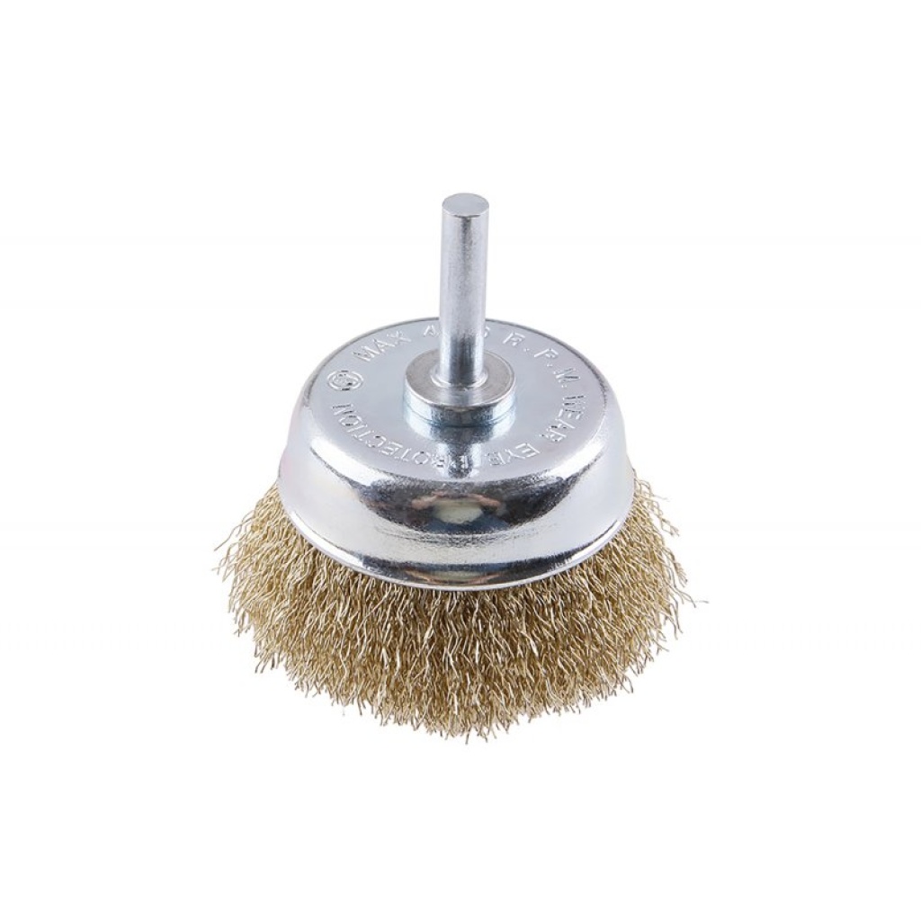 Bænkbørste – kop, design: bølgetråd 0,25 mm – messingbelagt, diameter 65 mm, skaft 6 x 27 mm, galvaniseret børstehus, antal tråde: 1512, trådlængde: 18,5 mm, maks. Tilladt hastighed: 4500 1 / min, anvendelse: til polering, opruening, fjernelse af rust og grater, emballage: blister med eurohul.